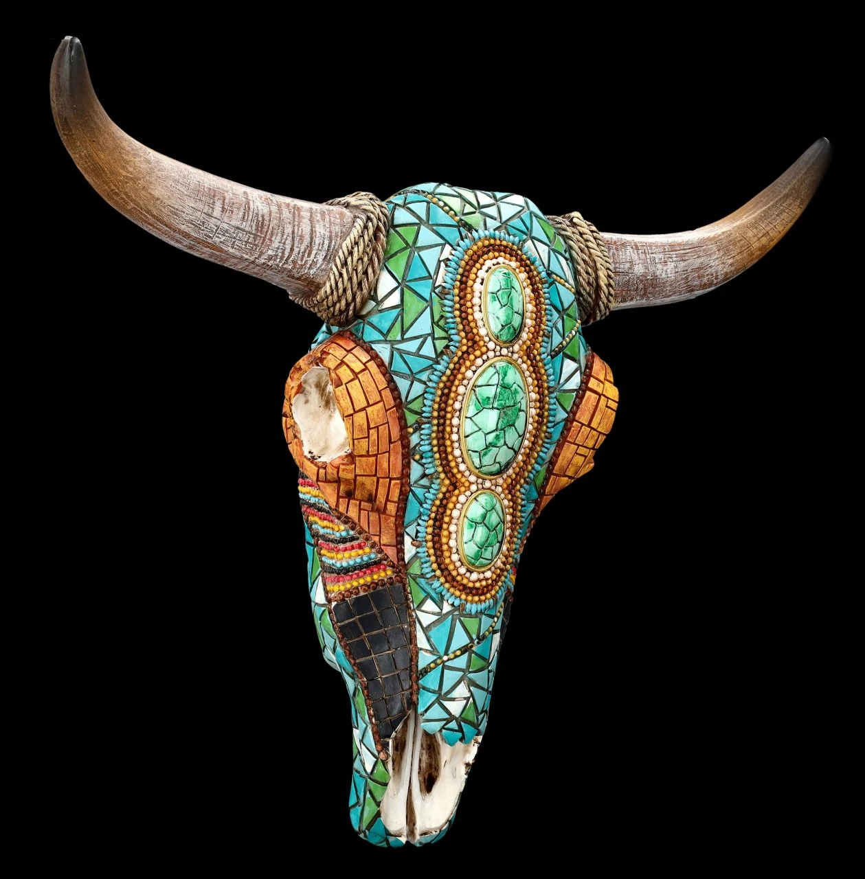 Mit einem fantastischen Western Mosaik in indianischem Muster und herrlich bunten Farben ist dieser prächtige Kuh-Schädel verziert. Er wurde aus Kunststein (Polyresin) gefertigt und aufwändig handbemalt. Der Kuh-Totenkopf mit dem Western-Mosaik ist zum Hängen und 27 cm hoch, 31,5 cm breit und 9 cm tief. Er ist eine imposante Wanddeko auch für jeden Westernsaloon und wird sofort alle Blicke auf sich ziehen. Für alle Western-Fans ist diese Wanddeko auch ein fantasievolles Geschenk.