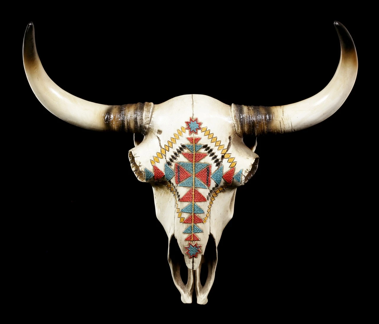 Mit diesem außergewöhnlichen Rinderschädel können Sie sich einen Teil der mystischen Aztekenkultur nach Hause holen. Das mit Aztekenschmuck dekorierte Wandrelief zieht alle Blicke auf sich und verbreitet eine mythische Aura.