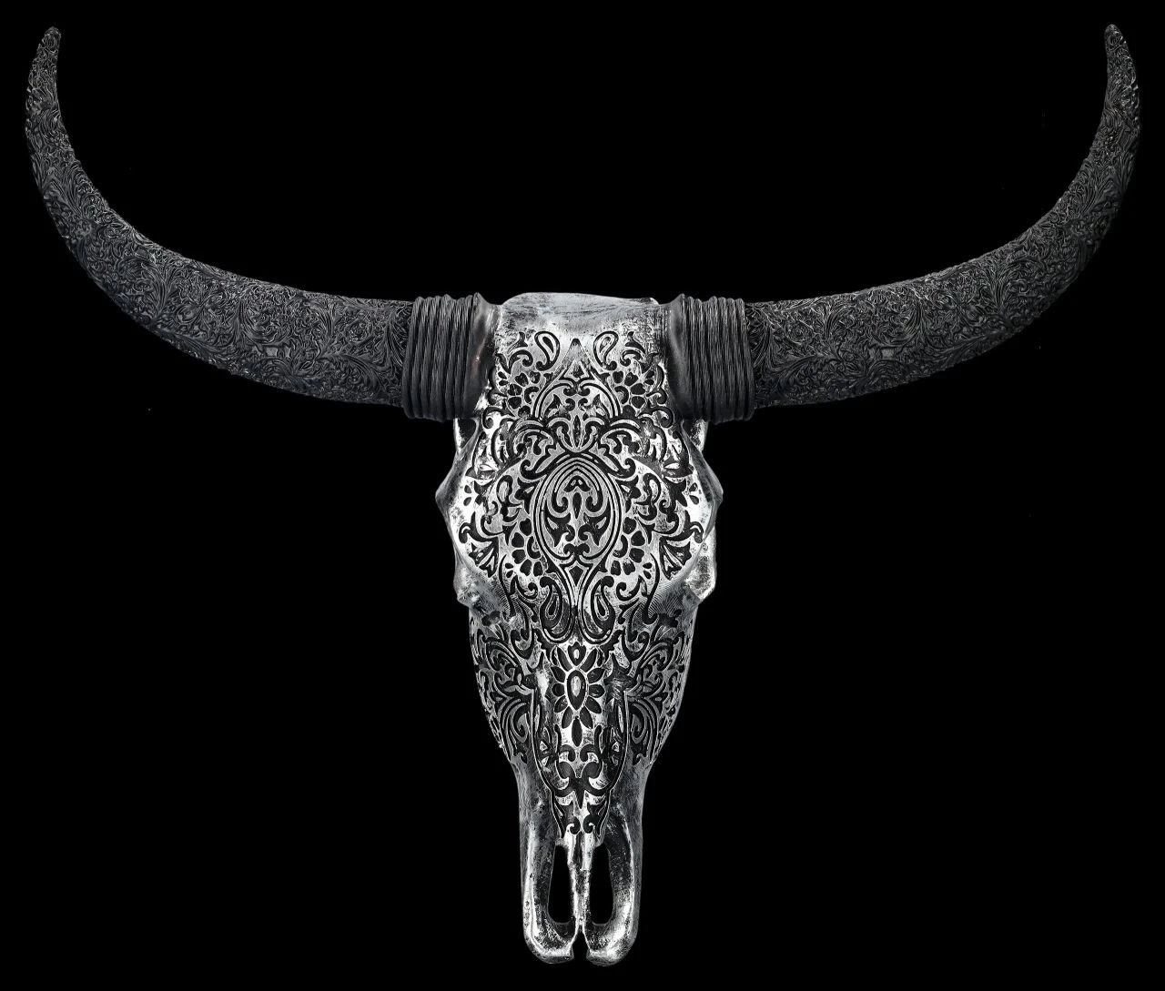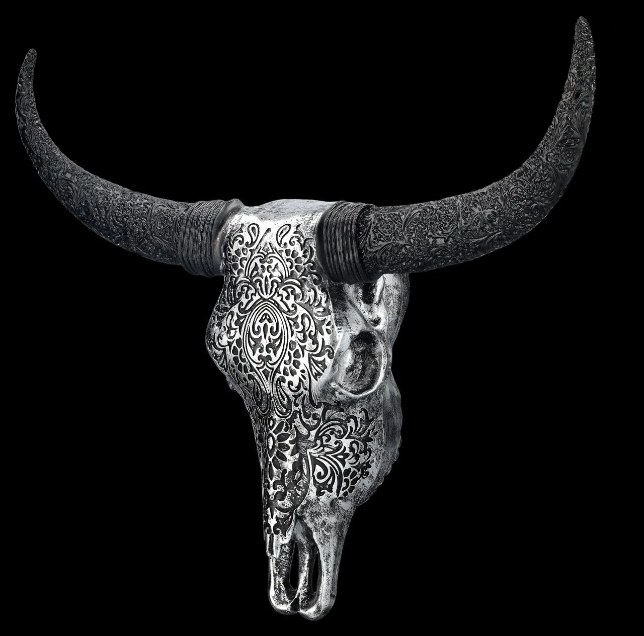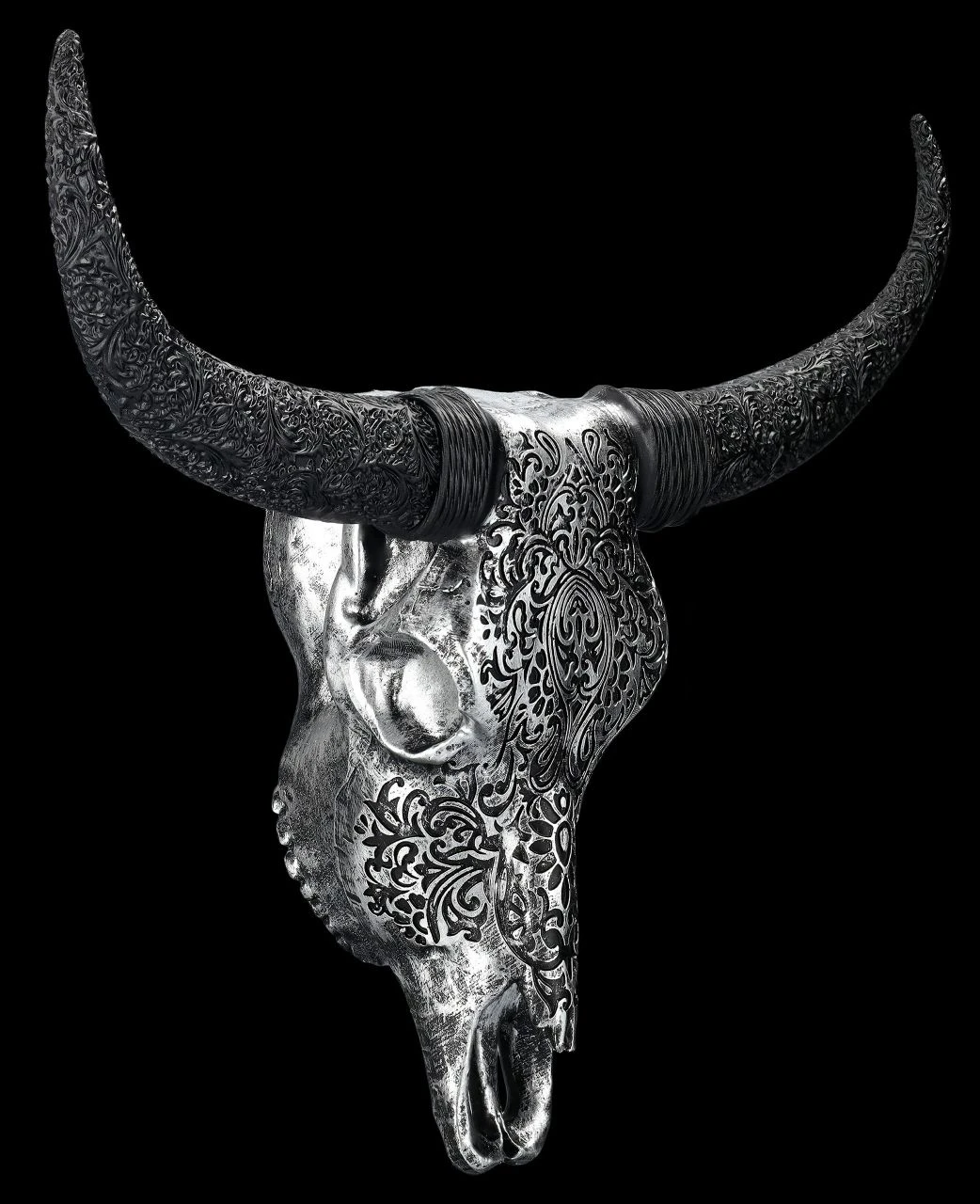 Der silberfarbene Rinderschädel mit den aufwändigen Verzierungen am Schädel und den schwarzen Hörnern ist ein absolut fantastischer und auffälliger Blickfang. Das filigrane Muster wirkt so, als hätte sich ein Künstler viel Zeit genommen, um den Rinderschädel mit den großen Hörnern mit barocken, kunstvollen Mustern zu verzieren. Der prächtige 30 cm hohe, 33 cm breite und 9 cm tiefe Schädel aus hochwertigem Kunststein (Polyresin) wurde detailreich von Hand bemalt..Er gibt als dekoratives Wandrelief zum Hängen jedem Ambiente ein richtiges Western-Feeling und ist somit ein fantastisches Geschenk für jeden Western-Fan.