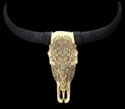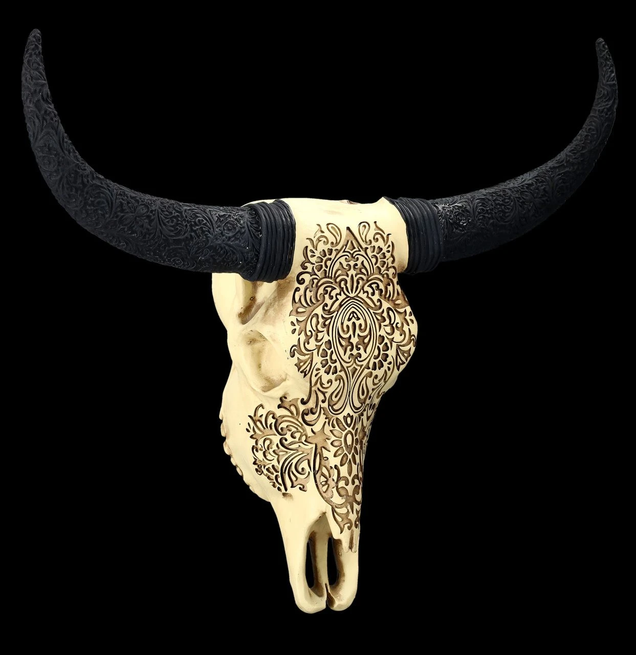 Als hätte sich ein Künstler viel Zeit genommen, um in filigraner Kleinarbeit einen knochenfarbenen Rinderschädel mit großen Hörnern mit kunstvollen Mustern zu verzieren. Der 30 cm hohe, 33 cm breite und 9 cm tiefe Rinderschädel wurde aufwändig aus hochwertigem Kunststein (Polyresin) gefertigt und von Hand bemalt. Der Rinderschädel mit den barocken Verzierungen ist als Wandrelief zum Hängen ein fantastischer Blickfang und gibt jedem Ambiente ein richtiges Western-Feeling.