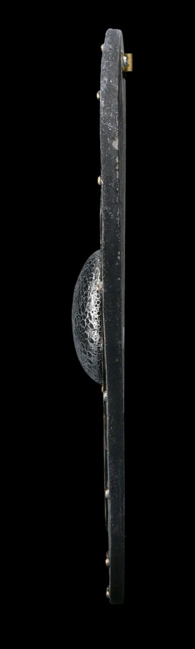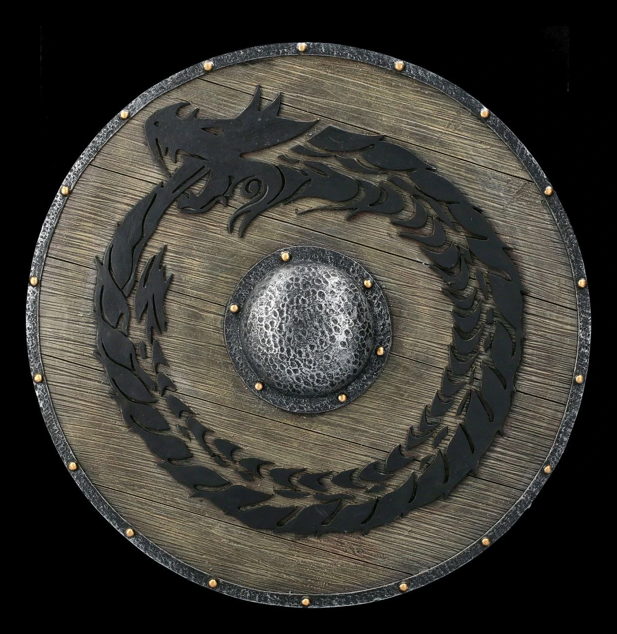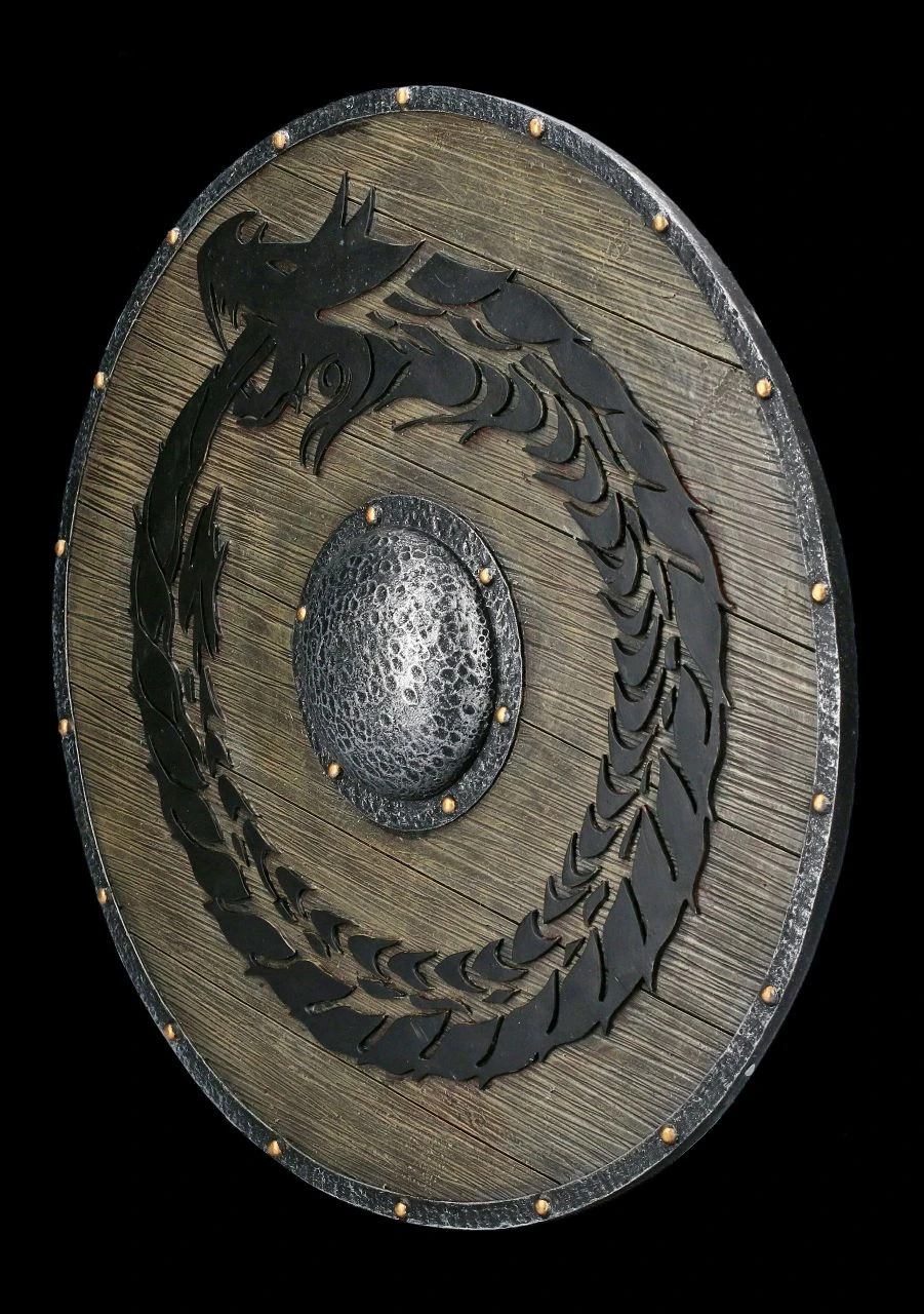 Wie aus einem edlen Hartholz gearbeitet und mit Eisenbeschlägen versehen, sieht dieses detailreiche Wikinger Schild mit dem fein herausgearbeiteten schwarzen Drachen aus. Das ausgefallene Wikinger Schild ist sorgfältig aus Kunststein (Polyresin) gearbeitet und sehr realistisch handbemalt. Mit seinem Durchmesser von 31,5 cm und der Tiefe von 3 cm schmückt das imposante Wandrelief jedes Zuhause eines Wikingers.