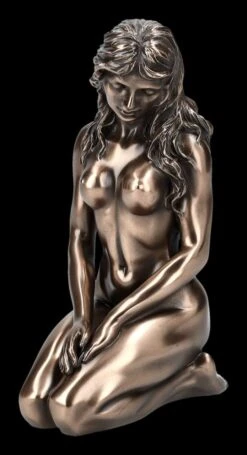 Erwartungsvoll kniet die junge nackte Schönheit auf dem Boden. Sanft lächelnd hat sie ihren Kopf leicht geneigt und Arme ruhen entspannt in ihrem Schoß. Die weibliche Akt-Figur aus der Studio Collection von Veronese wurde sehr edel aus hochwertigem Kunststein (Polyresin) gefertigt und aufwändig bronziert. Die Schönheit dieser 15 cm hohen, 5 cm breiten und 9 cm tiefen kleinen Akt-Figur wirkt nicht nur erotisch, sondern auch sehr effektvoll und elegant. Wo diese stilvolle weibliche Akt-Figur auch ihren Platz findet, sie wird ein optischer Blickfang und ist damit auch ein wunderbares Geschenk für jeden, der sich an der Ausstrahlung dieser schönen Figur erfreut.