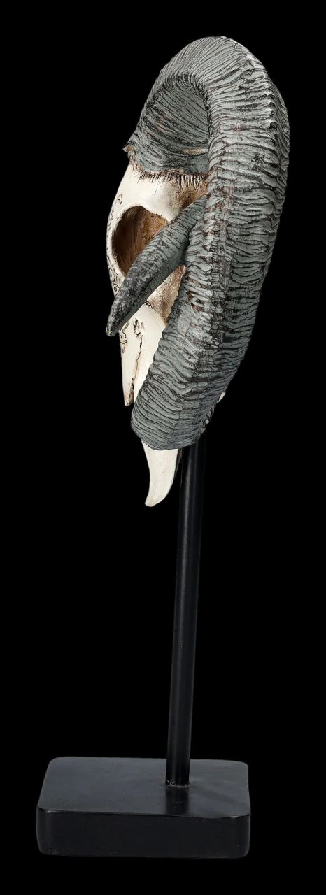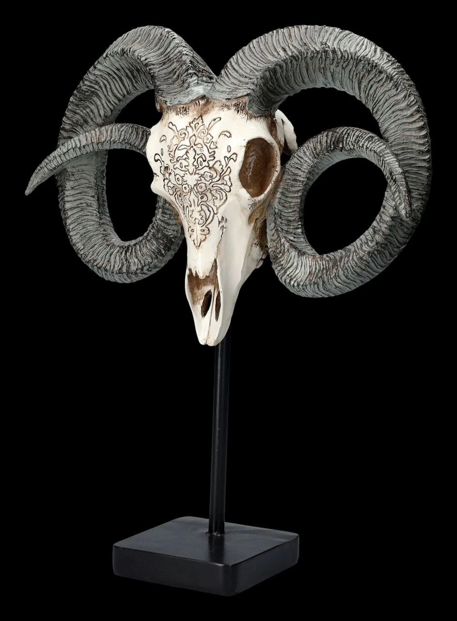 Eine ungewöhnliche und einfach fantastische Deko für jedes Ambiente ist dieser verzierte Widder-Totenschädel mit den majestätischen und detailreichen Hörnern. Ob im Büro, der Praxis oder in Ihrem Zuhause – dieser prächtige Widderschädel wird sofort alle Blicke auf sich ziehen. Der 26 cm hohe, 34 cm breite und 11 cm tiefe Widder-Totenkopf mit den vielen Details wurde sorgfältig und kunstvoll aus Kunststein (Polyresin) gefertigt und von Hand bemalt. Er ruht auf einem Metallsockel und hat mt diesem eine Gesamthöhe von 41 cm. Mit den Verzierungen und vor allem mit den prachtvollen Hörnern ist der Widder-Totenkopf auch ein perfektes Geschenk für jemanden, der im Sternzeichen des Widders geboren ist.
