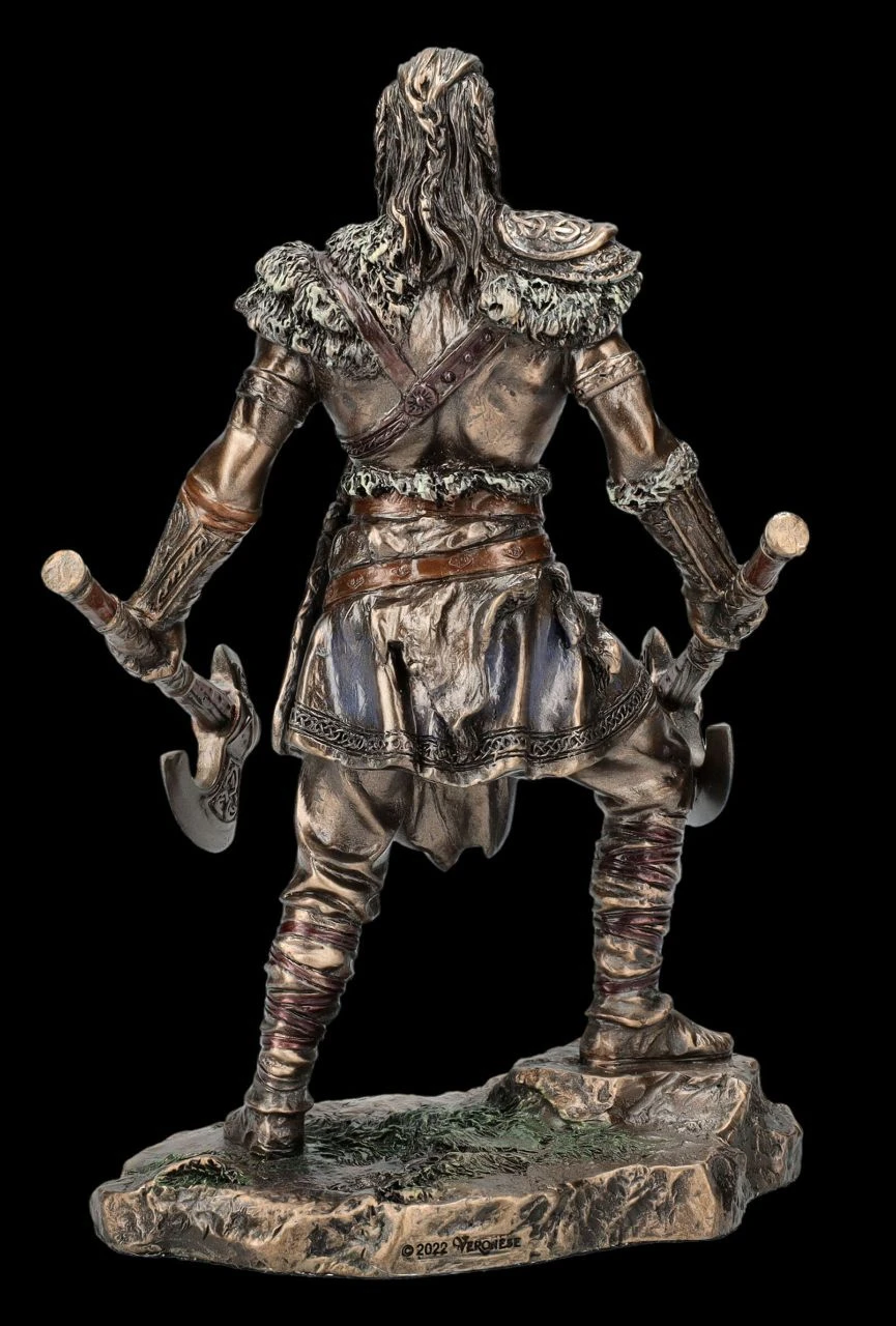 Einer der berühmtesten Wikinger ist in den isländischen Sagen Gunnar. Er galt als großer und tapferer Krieger und wird bei dieser wunderbaren kleinen Figur aus der Studio Collection von Veronese auch detailreich so dargestellt. In beiden Händen hält die athletische Figur des mächtigen Kriegers seine beiden Streitäxte. Der entschlossene Blick zeigt, dass man sich ihm nicht ungestraft nähern sollte. Die faszinierende Wikinger Figur aus hochwertigem Kunststein (Polyresin) ist 16,5 cm hoch, 10,5 cm breit und 7 cm tief. Sie ist nicht nur sehr detailreich, sondern besticht auch durch die edle Bronzierung und zurückhaltende Colorierung. Gunnar mit zwei Äxten passt auch wunderbar zur Wikinger Figur der Brynhild mit zwei Äxten aus unserem Shop und ist für alle, die von den Wikingern und der nordischen Sagenwelt fasziniert sind, ein perfektes Geschenk.