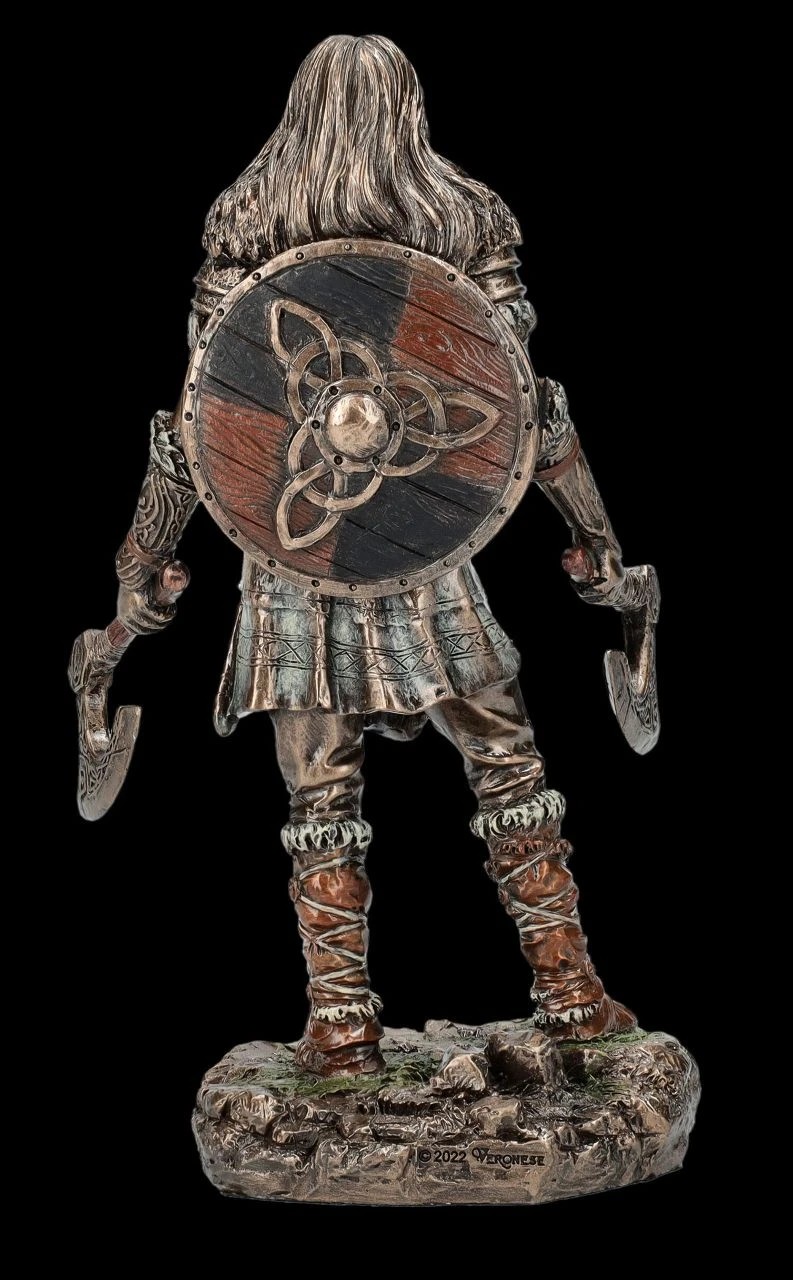 Brynhild wird in den nordischen Sagen als Walküre, aber auch als Mensch dargestellt. Sie kommt jedoch auch in den Nibelungensagen als starke Frau vor, die lediglich durch einen Trick besiegt werden konnte. Bei dieser wunderbaren kleinen Figur aus der Studio Collection von Veronese ist Brynhild als starke Kämpferin detailreich. In beiden Händen hält die faszinierende, kampfbereite Brynhild Streitäxte. Der entschlossene Blick zeigt, dass man sich ihr nicht ungestraft nähern sollte. Die faszinierende Wikinger Figur aus hochwertigem Kunststein (Polyresin) ist 15,5 cm hoch, 9 cm breit und 6,5 cm tief und nicht nur sehr detailreich, sondern besticht auch durch die edle Bronzierung und zurückhaltende Colorierung. Brynhild mit zwei Äxten passt auch zur Wikinger Figur Gunnar mit zwei Äxten aus unserem Shop und ist für alle, die von den Wikingern und der nordischen Sagenwelt fasziniert sind, ein perfektes Geschenk.
