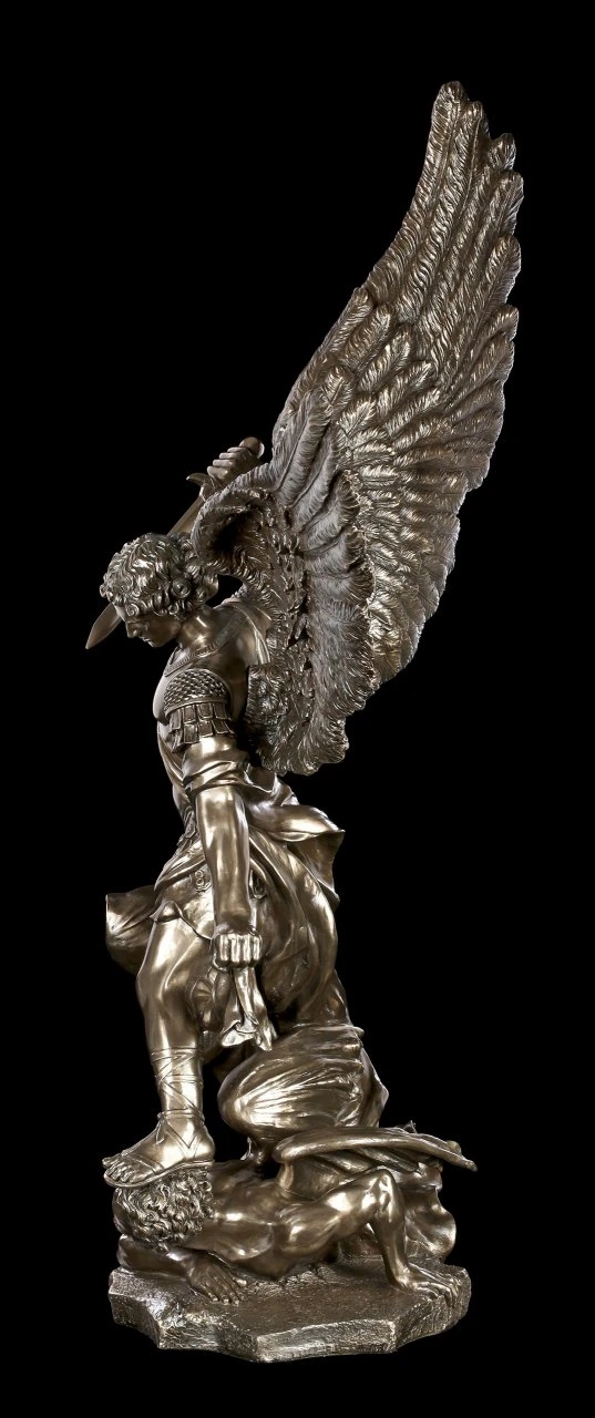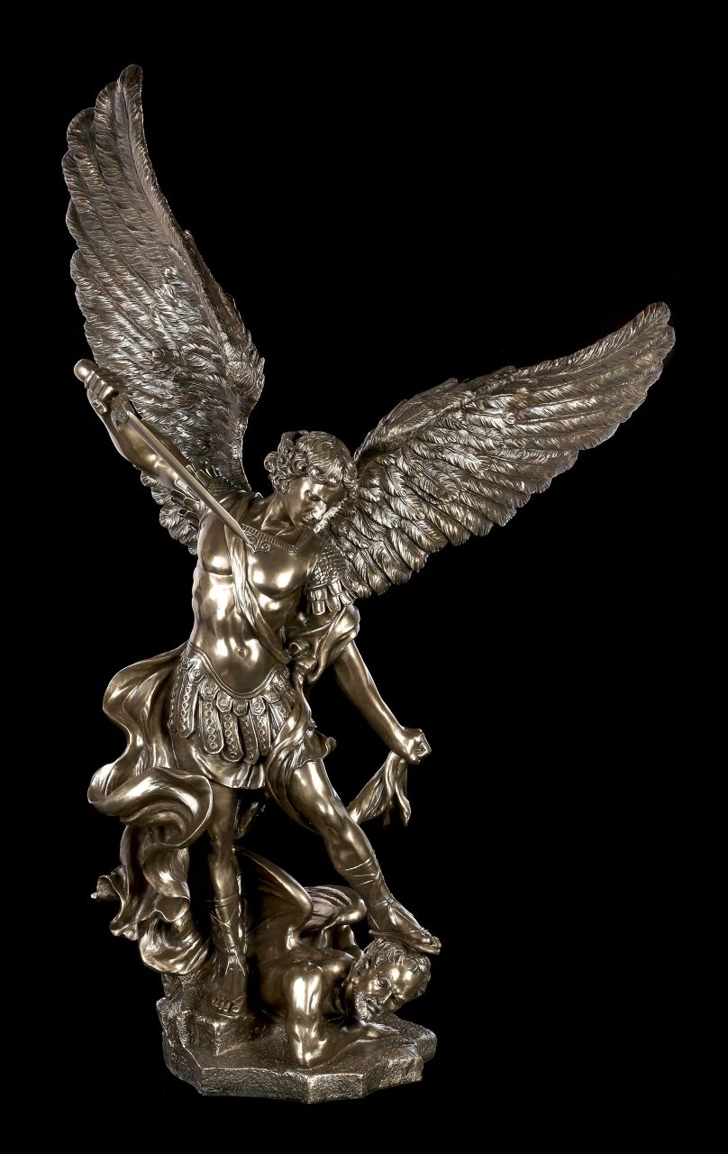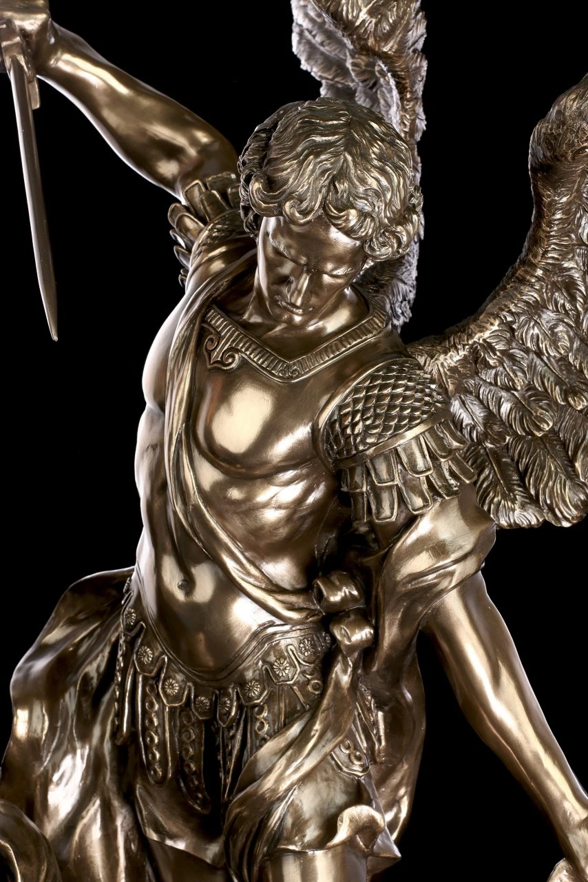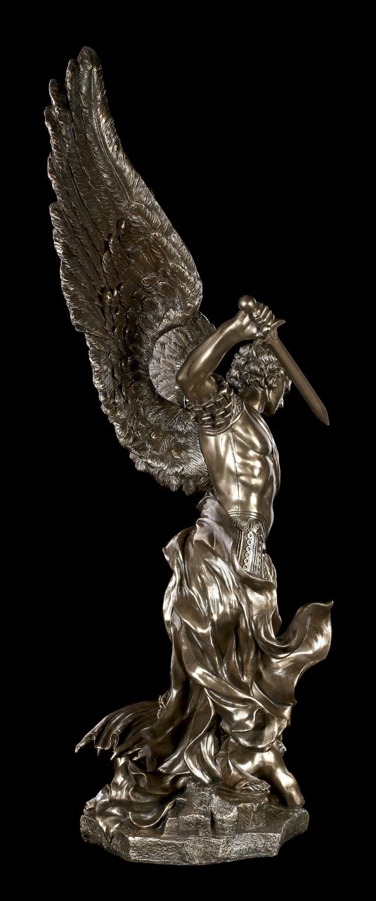 Diese imposante Figur des Heiligen Michael in Bronze-Optik ist sehr eindrucksvoll dargestellt. In der Offenbarung des Johannes im Neuen Testament erscheint der Heilige Michael als Bezwinger Satans. Er gilt als Helfer in der Not und Gefahr und ist auch der Schutzpatron der Deutschen und der katholischen Kirche und wird als Patron der Ritter verehrt. Bei dieser äußerst dekorativen Figur aus der Studio Collection von Veronese erhebt der Erzengel Michael sein Schwert gegen Satan, auf den er bereits seinen Fuß gestellt hat. Die riesige Skulptur ist sehr edel bronziert. Der Erzengel Michael ist sorgfältig und detailreich aus Kunststein (Polyresin) gefertigt und hat eine Höhe von 110 cm, eine Breite von 70 cm und eine Tiefe von 40 cm Die Flügel und das Schwert sind zum Stecken. Die bronzierte große Figur des Erzengel Michael ist ganz sicher ein außergewöhnlicher Blickfang.