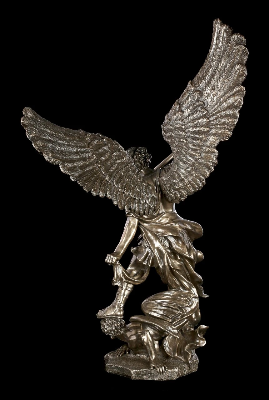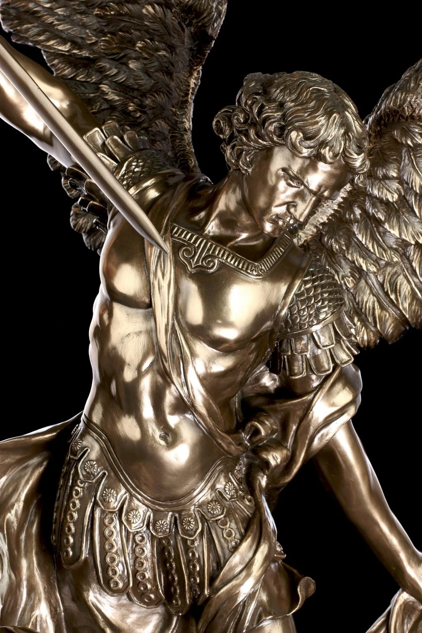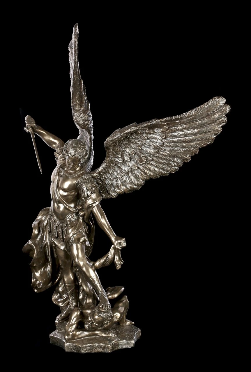 Diese imposante Figur des Heiligen Michael in Bronze-Optik ist sehr eindrucksvoll dargestellt. In der Offenbarung des Johannes im Neuen Testament erscheint der Heilige Michael als Bezwinger Satans. Er gilt als Helfer in der Not und Gefahr und ist auch der Schutzpatron der Deutschen und der katholischen Kirche und wird als Patron der Ritter verehrt. Bei dieser äußerst dekorativen Figur aus der Studio Collection von Veronese erhebt der Erzengel Michael sein Schwert gegen Satan, auf den er bereits seinen Fuß gestellt hat. Die riesige Skulptur ist sehr edel bronziert. Der Erzengel Michael ist sorgfältig und detailreich aus Kunststein (Polyresin) gefertigt und hat eine Höhe von 110 cm, eine Breite von 70 cm und eine Tiefe von 40 cm Die Flügel und das Schwert sind zum Stecken. Die bronzierte große Figur des Erzengel Michael ist ganz sicher ein außergewöhnlicher Blickfang.