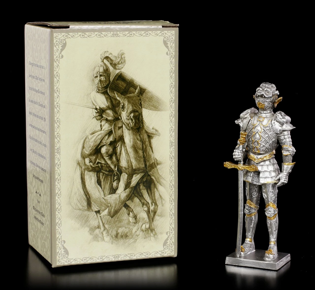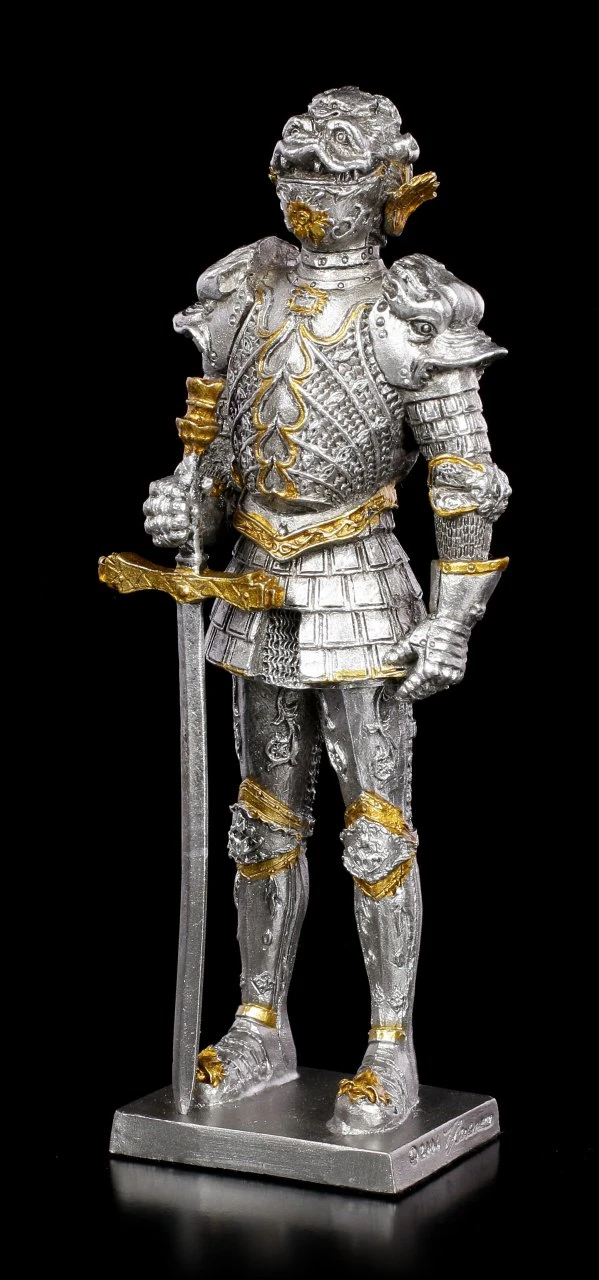 Der kleine Zinnritter aus der Serie Myth & Legends – Historical Knights von Veronese ist detailreich verziert und zeigt eine Rüstung mit Drachenhelm. Die zinnfarbene Ritter Figur steht auf einem kleinen Sockel und ist mit goldenen Details versehen. Ergänzen Sie Ihre Zinn Ritter Sammlung mit diesem umwerfenden Stück.