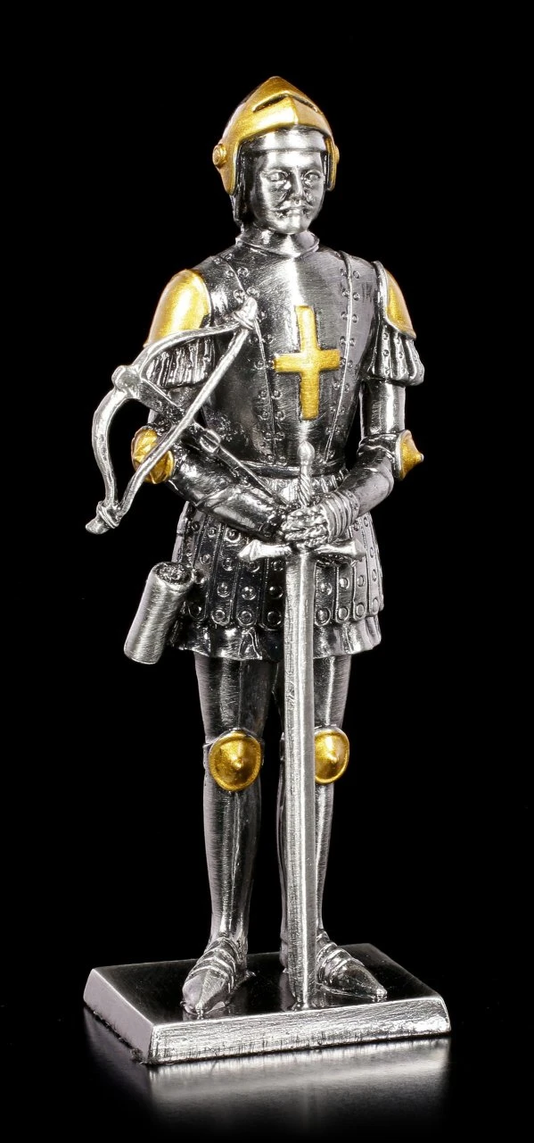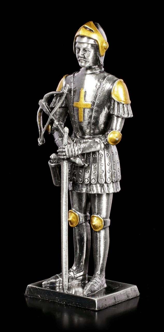 Die stehende Zinn Ritter Figur ist aus dem Haus Veronese und gehört zur Serie Myth & Legend – Historical Knights. Der Ritter hält in seiner Hand eine Armbrust und ein Schwert. Da das Visier des Ritters geöffnet ist, kann man dassein Gesicht sehen. Die goldfarbenen Details der Rüstung passen perfekt zum Zinn. Ergänzen Sie Ihre Sammlung um eine wunderbare Statuette.