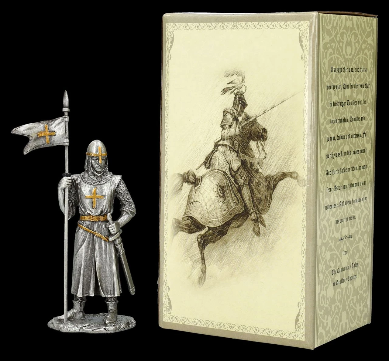 Aus der ‚Historical Knights‘ Collection von Veronese stammt dieser kunstvoll und fein gearbeitete Kreuzritter aus Zinn mit Fahne. Der sorgsam handbemalte Zinnritter ist 10,5 cm hoch (mit der Fahne sind es 13,5 cm), 5 cm breit und 3,5 cm tief. Sammler werden von diesem meisterhaften Kreuzritter begeistert sein. Er ist auch ein fantastisches Geschenk und kommt mit einem toll bedruckten Geschenkkarton.